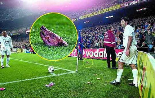 Луиша Фигу ждал еще один тяжелый удар – на поле, миновав стюардов, появился Джимми Джамп, куле и самый известный стрикер последних лет, и, пробегая мимо португальского капитана, метнул ему в лицо барселонский флаг.