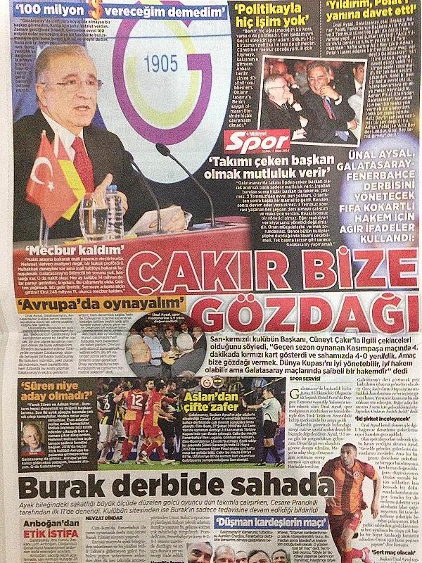 Вспомнив Унала Айсала, нельзя обойти стороной и его критику в адрес главного арбитра дерби Джюнейта Чакыра. Как только стало известно, что именно он рассудит стамбульских грандов, президент Сарая начал атаку на служителя фемиды, напомнив и об апрельском матче с Касымпашой, в котором Чакыр уже на 7-й минуте удалил Хакана Балту, после чего Львы на своем поле "попали" 0:4. Громкую фразу Унала Айсала не обошло стороной еще одно крупное издание Milliyet: "Чакыр лишит нас преимущества против Фенербахче".