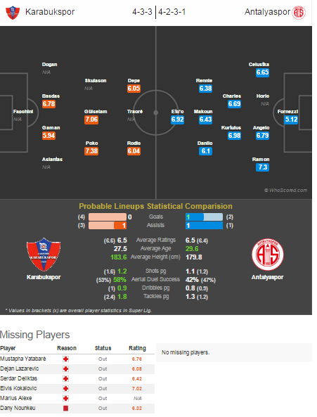 Наставник хозяев Тудор проявил себя как тренер, который не привык ротировать состав команды, потому на поле ожидается приблизительно та же стартовая 11-ка. В матче с Бешикташем Карабюкспор играл с пятью защитниками, но, скорее всего, на матч против Антальиспора построение команды вернется к привычным четырем оборонцам.