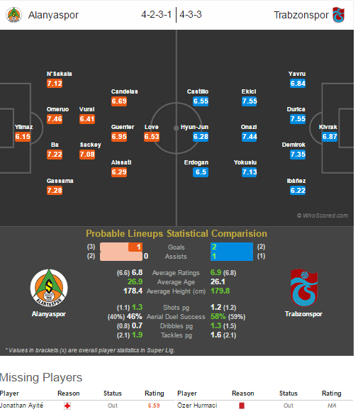 Эксперимент наставника Трабзонспора Эрсуна Янала в матче прошлого тура против Османлыспора (0:2) с тремя защитниками провалился, потому, судя по всему, на матч против Аланииспора гости снова вернуться к модели с четырьмя игроками в обороне.