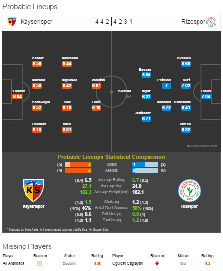 У Кайзериспора под вопросом участие голкипера Ахамады, который повредился после прошедшего тура. Булу и Веллитон в том туре вышли в паре в нападении. Несмотря на не самую лучшую производительность, хозяева должны выйти на матч против Ризеспора с такой же линией атаки.