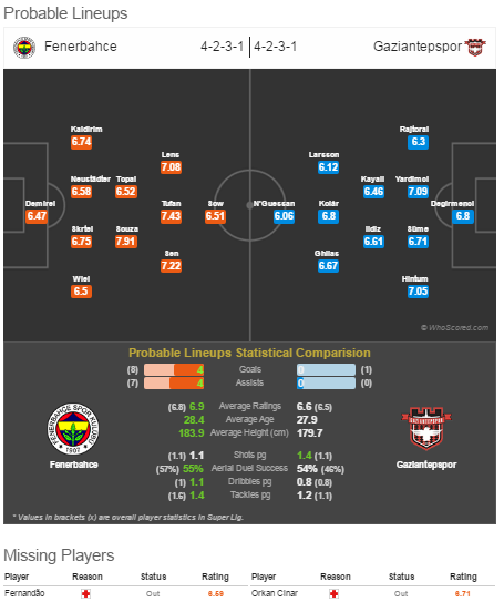 У хозяев по-прежнему много футболистов в лазарете: Эмре Ташдемир, Денис Йылмаз, Сердар Куртулуш, Эрдем Озенк и Мертер Юдже. К ним добавился и удаленный в прошлом поединке Исмаил Конук.