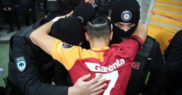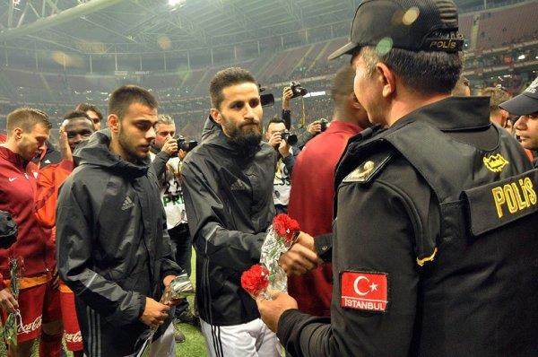 На отчетный поединок команды выходили с баннером против терроризма. Перед началом игры футболисты команд пожали руки полицейским, а одного из них капитан хозяев Инан вывел в центр поля, чтобы зрители подарили представителю правоохранительных органов аплодисменты — Тюрк Телеком Арена не подкачала.