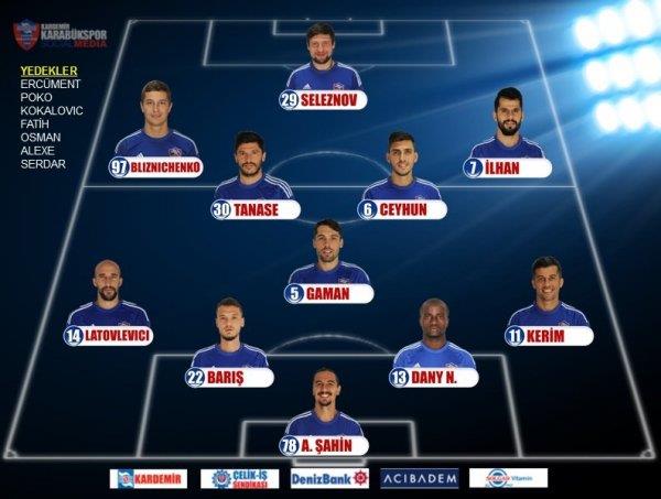 Кардемир Карабюкспор: Шахин — Гэман, Башдаш, Нункеу, Латовлевич — Танасе (Бийого, 25), Гюльселям — Депе (Алексе, 81), Зенгин, Близниченко (Деликташ, 68) — Селезнев.