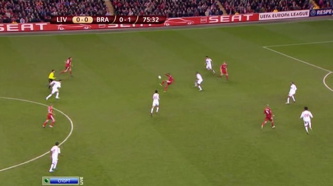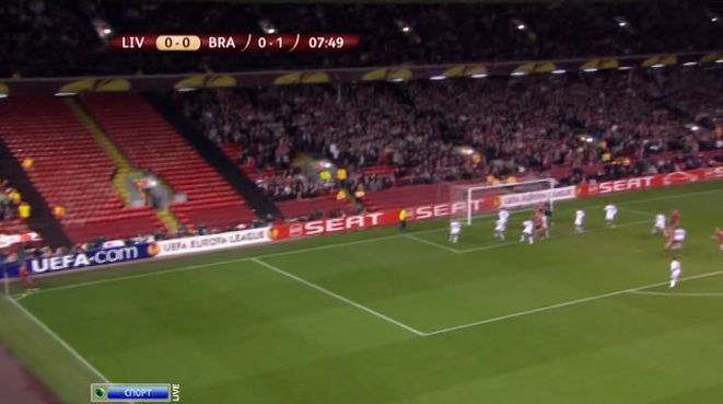 у отметим, что с первой до последней минуты футболисты Браги ясно дали понять, что приехали на Анфилд Роуд с целью отстоять результат, добытый в первом поединке. Можно предположить, что в подобном же ключе команда будет действовать и в Киеве. О толковых позиционных атаках не было и речи, ставка определенно делалась на контратаки и скорость фланговых игроков группы атаки. Что и говорить, если свой самый опасный момент у ворот Рейны португальцы создали благодаря счастливому рикошету. Алан в ворота попасть не сумел.