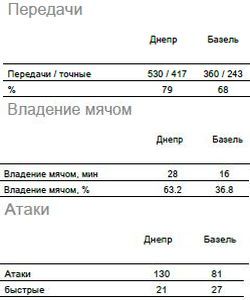 Днепр не подвел - команда без устали атаковала, создавая момент за моментом. Цифры, приведенные рядом, отчетливо демонстрируют, насколько серьезным было преимущество подопечных Рамоса. Качественная игра в пас, владение мячом, огромное количество атак, но... Только три удара в створ. Против двух у Базеля. На групповом этапе Днепр показывал великолепную реализацию, но в плей-офф она куда-то исчезла.