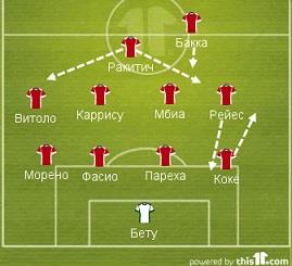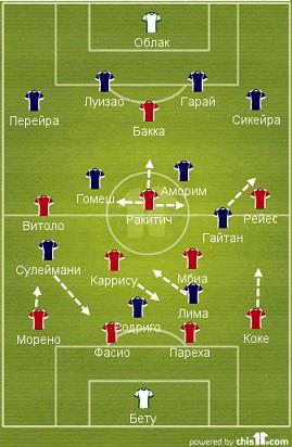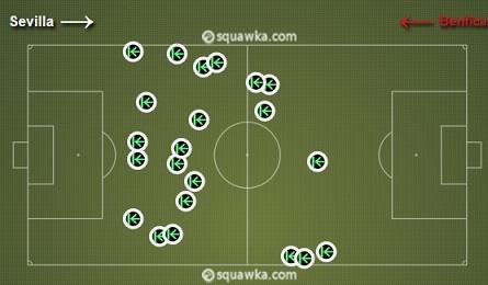 Унаи Эмери решил действовать максимально аккуратно и выбрал схему 4-2-3-1 с Ракитичем в роли атакующего хавбека и единственным форвардом в лице Бакка. Более агрессивный вариант тактической расстановки с двумя форвардами (Гамейро – Бакка) был отброшен в сторону. Правильность выбора Эмери подтвердил матч. Дополнительный игрок в полузащите позволил Севилье лучше контролировать мяч и избегать затяжного владения соперника, а следовательно, и не давать техничным игрокам Бенфики больше возможностей для поиска оптимальных решений в финальной фазе атак. Соотношение владения мячом в матче составило 51% на 49% в пользу номинальных хозяев, что было вполне комфортно для испанцев.