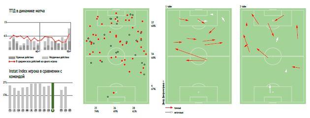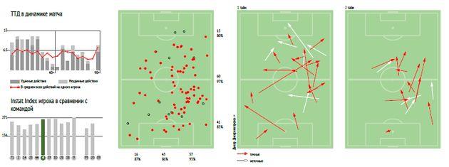 По итогам этой встречи именно у Николы оказался самый высокий Instat Index. И это при том, что он не забил и не отметился ассистом. Причины? Во-первых, хорошая работоспособность: 77 ТТД при браке в 53% для "столба" — это очень неплохо. Более того, это даже нивелирует низкий процент выигранных единоборств (29%) и 24 потери мяча.