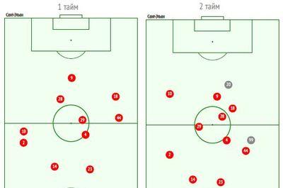 Учитывая то, что в первом тайме Сент-Этьенн развивал атаки правым флангом в основном за счет забегов активного Теофила-Катерина, Коноплянке приходилось часто глубоко садиться назад, доигрывая за "своим" футболистом. После перерыва, судя по графику усредненных позиций, Маркевич эту задачу с Жени частично снял, охладив при этом атакующий пыл своих фулбэков Влада и Федецкого.
