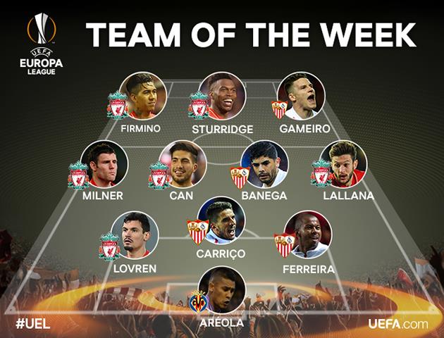 Команда недели в ЛЕ: Ареола – Феррейра, Карриссо, Ловрен – Банега, Джан, Лаллана, Милнер – Гамейро, Фирмино, Старридж.