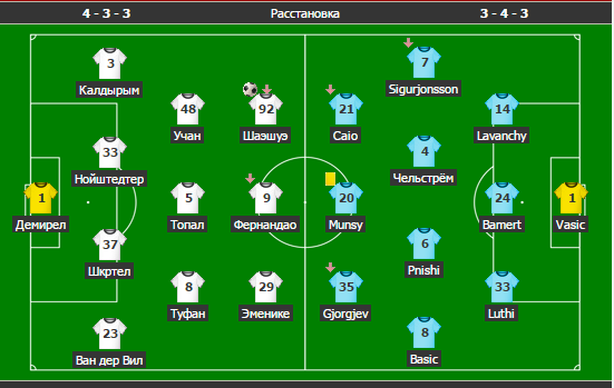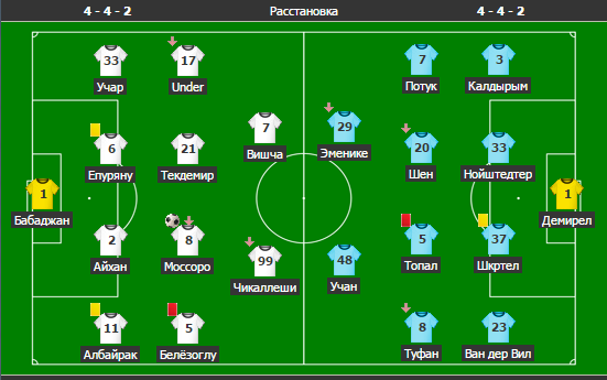 Ориентировочный состав: Демирель – ван дер Виль, Шкртел, Кьяер, Калдырым – Топал, Туфан – Уджан, Стох – ван Перси, Эменике.
