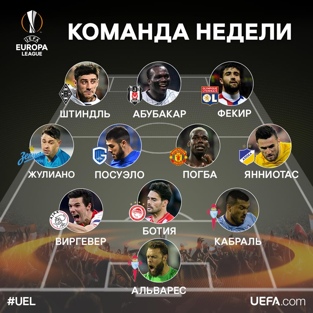 Символическая сборная Лиги Европы по версии УЕФА: Серхио Альварес (Сельта) — Густаво Кабраль (Сельта), Альберто Ботия (Олимпиакос), Ник Виргевер (Аякс) - Яннис Янниотас (АПОЕЛ), Поль Погба (Манчестер Юнайтед), Алехандро Посуэло (Генк), Жулиано (Зенит) - Набиль Фекир (Лион), Винсент Абубакар (Бешикташ), Ларс Штиндль (Боруссия М).