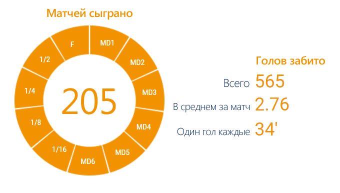 Всего было сыграно 205 матчей, учитывая все раунды квалификации, групповой этап и плей-офф. Команды сумели порадовать зрителей 565 голами.