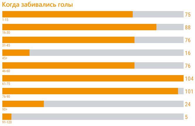 Чаще всего клубы отмечались в середине второго тайма и его конце. Наименьшее количество голов (без учета дополнительного времени) было забито в стартовые минуты матчей.