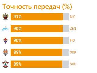 Лучшей командой в плане точности передач стала французская Ницца, игроки которой ошибались лишь в 9% своих пасов. Донецкий Шахтер входит в пятерку лучших с 89% точности. Худшим клубом по этому показателю стал Ростов — 77%. Отметим, что победитель ЛЕ — Манчестер Юнайтед — отдал на 1187 точных передач больше нежели Аякс. Финалисты розыгрыша стали лучшими командами по этому показателю.