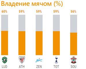Наибольшее количество времени владели мячом, в процентном соотношении, игроки болгарского Лудогорца (два матча 1/16 против Коппенгагена) — 60%, а североирландский Дундалк предпочитал отдать мяч под контроль соперников — 38%. Шахтер с 55% финишировал в этом Топе шестым.