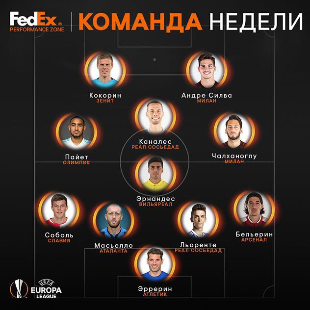 Полностью команда недели выглядит так: Эррерин (Атлетик) – Бельерин (Арсенал), Льоренте (Реал Сосьедад), Масьелло (Аталанта), Соболь (Славия) – Эрнандес (Вильярреал) – Чалханоглу (Милан), Каналес (Реал Сосьедад), Пайе (Марсель) – Андре Силва (Милан), Кокорин (Зенит).
