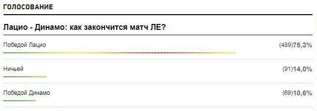 Голосование завершилось победой римского Лацио, за который отдали свои голоса 75,3% пользователей. За ничью проголосовало 14,6%, а в победу Динамо верят лишь 10,6% пользователей.