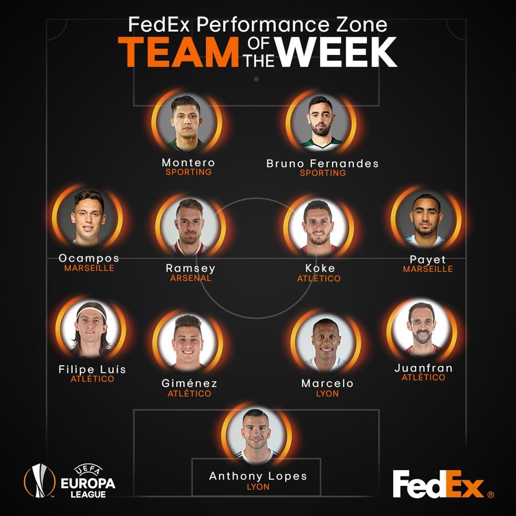 В символическую сборную первых матчей 1/8 финала Лиги Европы по версии УЕФА вошли четыре представителя Атлетико, по два – Лиона, Марселя и Спортинга и один – Арсенала.