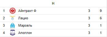Айнтрахт на своем поле уверенно обыграл Аполлон и с 9 очками возглавляет группу H. На втором месте с 6 пунктами в активе идет Лацио, который на выезде одолел Марсель.