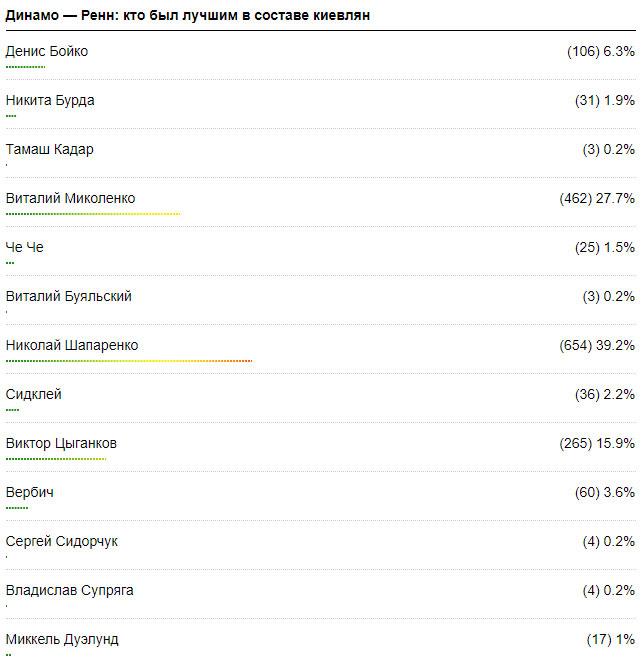 По итогам голосования на Football.ua читатели сайта признали лучшим игроком киевлян в этом матче Николая Шапаренко. Молодой украинский талант набрал 39.2% голосов.