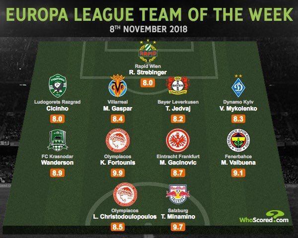 Стала известна символическая сборная по итогам прошедшего тура группового этапа Лиги Европы по версии WhoScored.