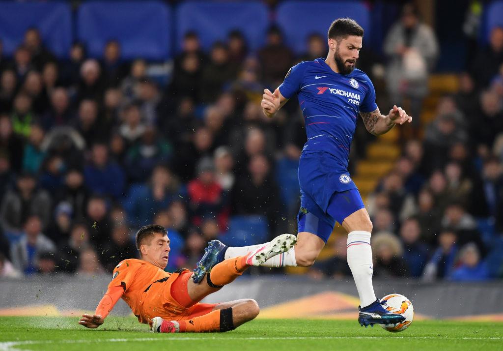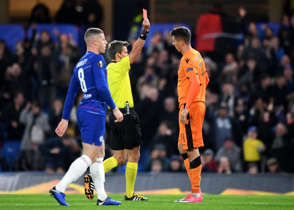 Украинский защитник был удален за фол последней надежды против Оливье Жиру, нарушив правила за пределами штрафной.