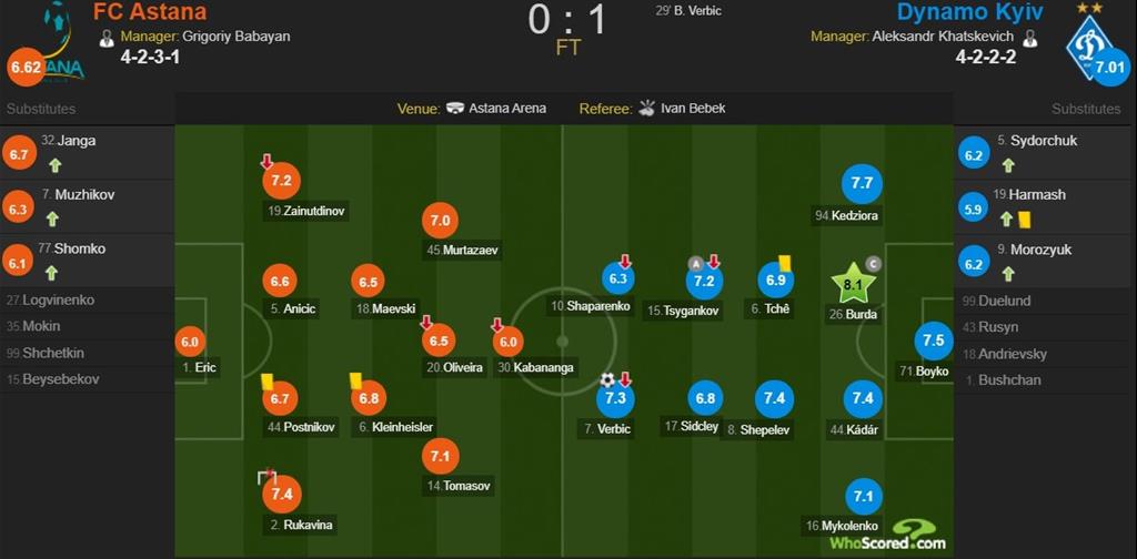 Отметим, что автор единственного забитого в матче гола Беньямин Вербич получил от WhoScored оценку 7,3.