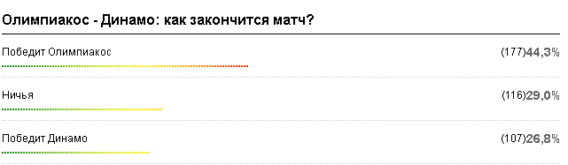По версии посетителей Football.ua, Олимпиакос выйдет победителем в данном поединке — за это проголосовало 44,3% человек. В победу киевлян верят 26,8% голосовавших.