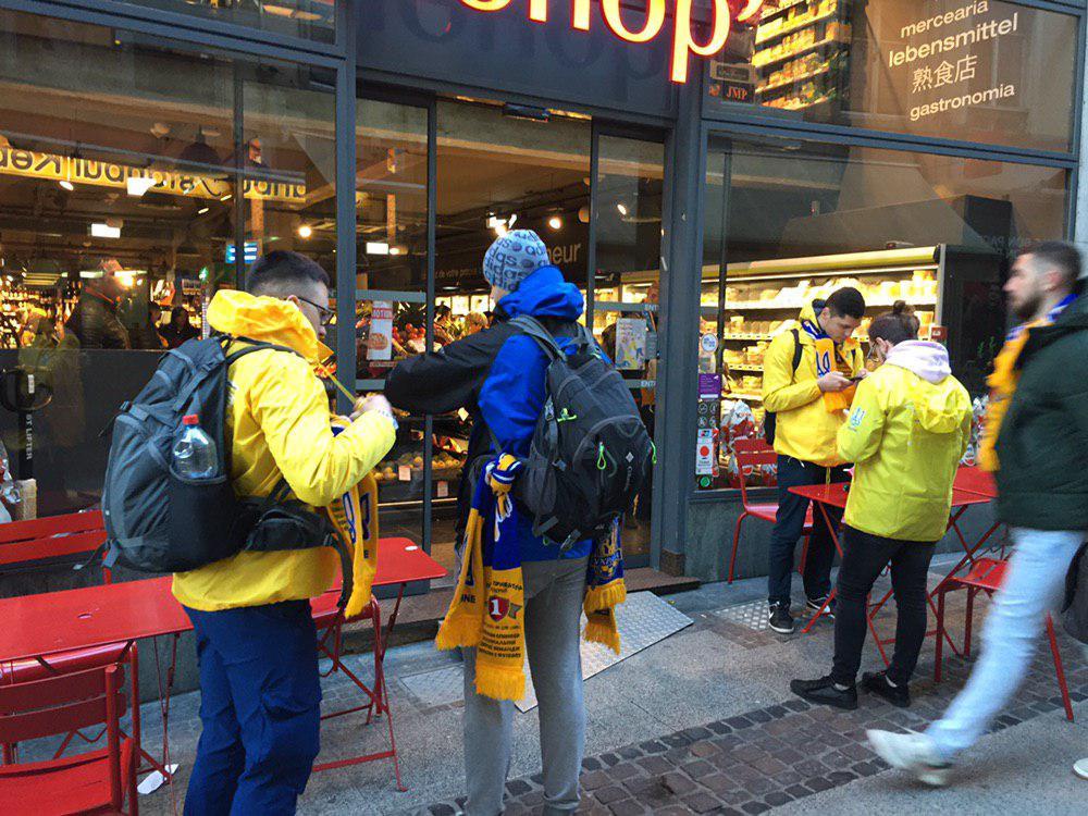 Но все же вы пришли сюда почитать про футбол. На то, что в городе состоится важнейший для местной сборной матч отбора на чемпионат Европы, намекали только… украинские фанаты в символике нашей сборной. Как минимум так ситуация выглядела в центре. За два часа все больше и больше украинцев встречались на улице.