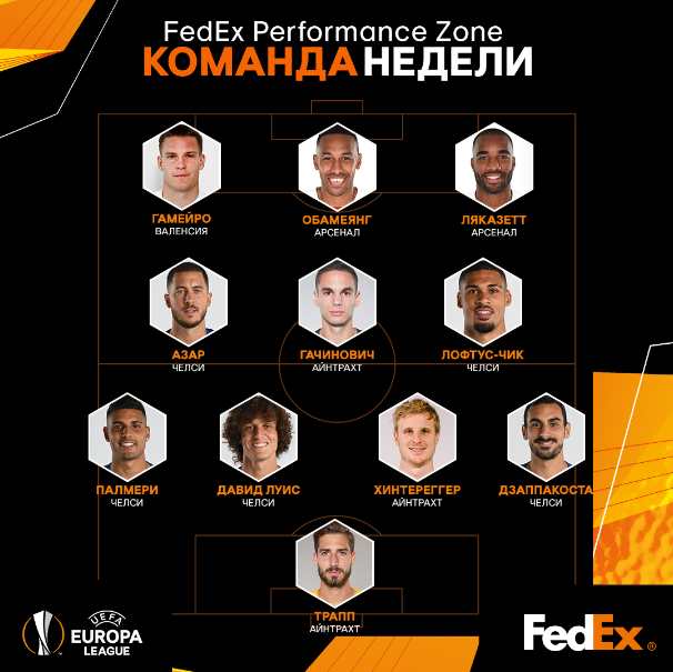 Символическая сборная недели: Трапп (Айнтрахт) — Дзаппакоста (Челси), Хинтереггер (Айнтрахт), Давид Луиз, Эмерсон (оба — Челси) — Гачинович (Айнтрахт), Лофтус-Чик, Эден Азар (оба — Челси) — Обамеянг, Ляказетт (оба — Арсенал), Гамейро (Валенсия).