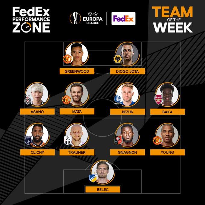 Белец (АПОЭЛ) – Янг (МЮ), Ньяньон (Ренн), Тройнер (ЛАСК), Клиши (Истанбул Башакшехир) – Сака (Арсенал), Безус (Гент), Мата (МЮ), Асано (Партизан) – Жота (Вулверхэмптон), Гринвуд (МЮ).