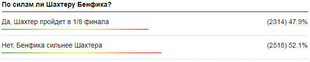 Большинство читателей Football.ua считает, что "горнякам" будет не по силам справиться с лиссабонским клубом. В соответствующем голосовании 52,1% респондентов отдали предпочтение Бенфике, а на проход Шахтера поставили 47,9% проголосовавших.