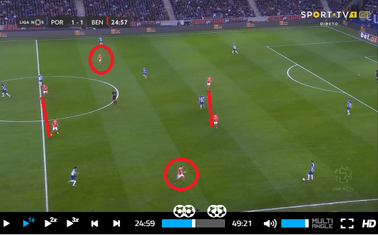 Абсолютно очевидно, что Бенфика не привыкла к интенсивному и организованному прессингу соперника. В чемпионате такого давления большинство соперников не оказывает, поэтому "орлы" могут себе позволить спокойно вести игру, продвигаясь вперед чаще всего по одному и тому же сыенарию. А, учитывая, зацикленность на фланговой игре, розыгрыш происходит через короткие пасы между центрбеками (Диаш-Ферру) и опорниками (Вайгль-Таарабт), опорниками и латералями (Гримальдо-Алмейда), после чего, построив треугольник ближе к краю поля, они пытаются вывести флангового хава (Серви-Пиззи/Рафа Сильва) или латераля на оперативное пространство по краю, с его продвижением до точки подачи в штрафную соперника.