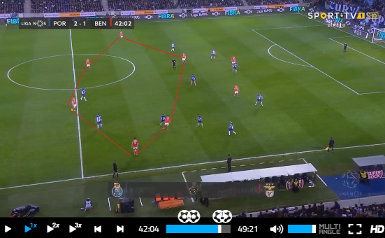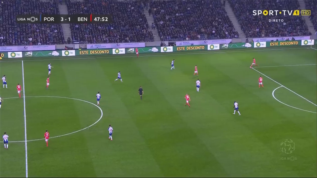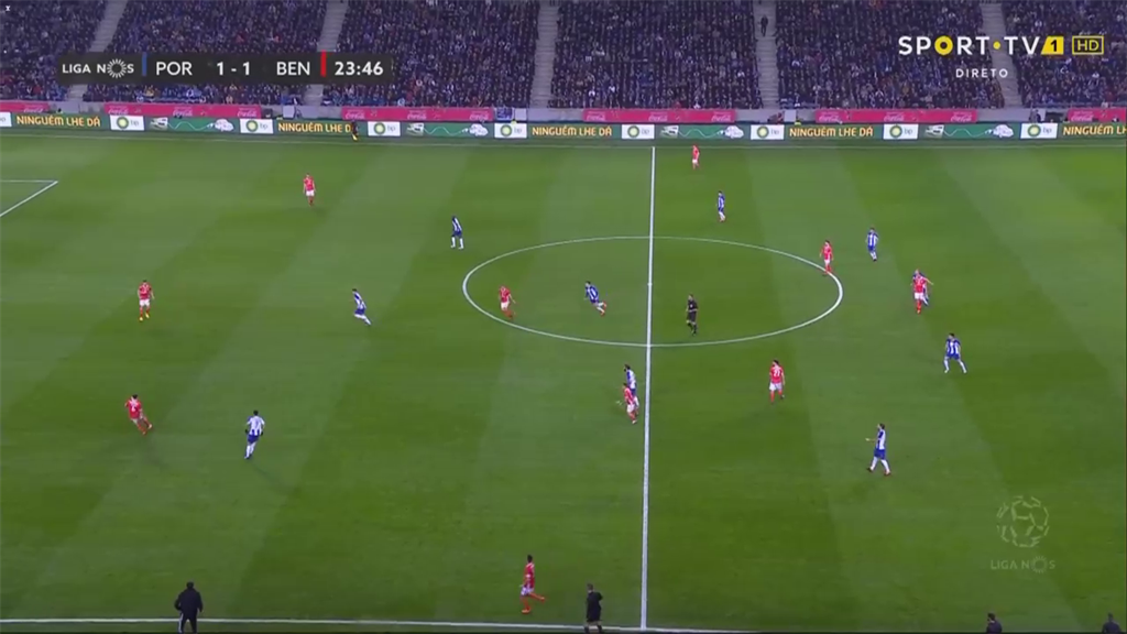 Конечно, возникает еще один вариант, на который в итоге Бенфика просто-таки сбилась в матче с Порту – длинные и средние передачи вперед. Чаще всего после короткого обыгрыша центрбеков с опорниками шла диагональ вперед во фланг, которая приводила к многочисленным единоборствам в воздухе и, часто, к потере владения, либо же заработанным аутам, невозможности выйти с фланга после вбрасывания, топтанию на месте, возврату на свою половину или потерям.