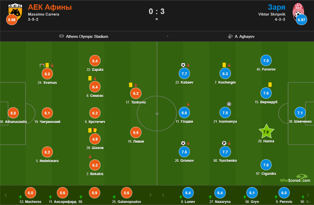 Луганская Заря в рамках группового этапа Лиги Европы переиграла на выезде греческий АЕК (0:3).