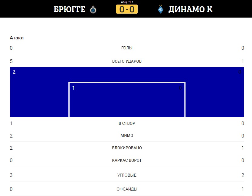 Предлагаем вам ознакомиться со статистическими показателями матча Брюгге — Динамо в первом тайме.
