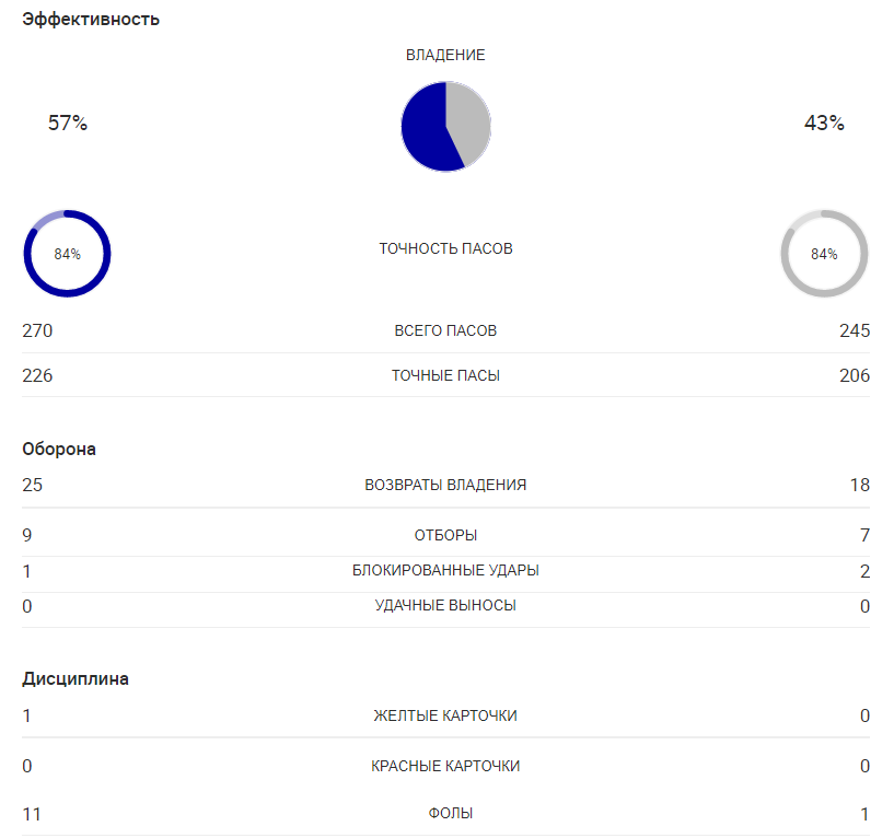 Нельзя не отметить, что в первом тайме подопечные Мирчи Луческу уступили сопернику по многим статистическим показателям. Так, владение мячом игроков Динамо составило 43%, тогда как у Брюгге — 57%.