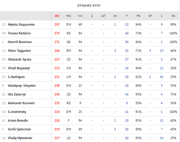 Статистический портал Instat традиционно оценил игру футболистов. Так, лучшую оценку в стане киевлян получил Николай Шапаренко — его индекс составил 297.