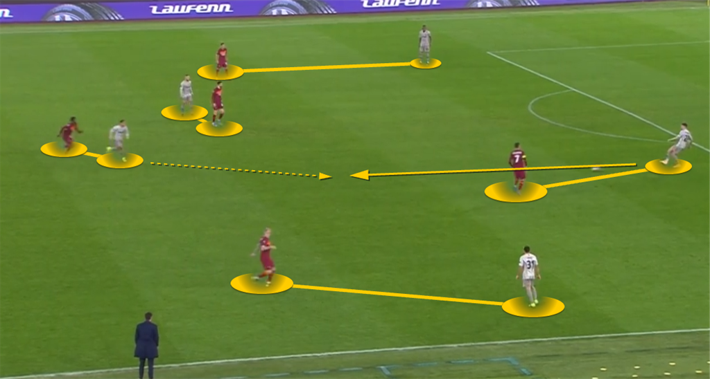 С первых же минут Рома решила прессинговать Шахтер достаточно высоко и большим количеством игроков. Римляне пытались не только оказывать давление на центральных защитников, но и поджимать центральных полузащитников, дабы Матвиенко и Витао не имели возможности выходить из-под этого прессинга короткими вертикальными передачами.