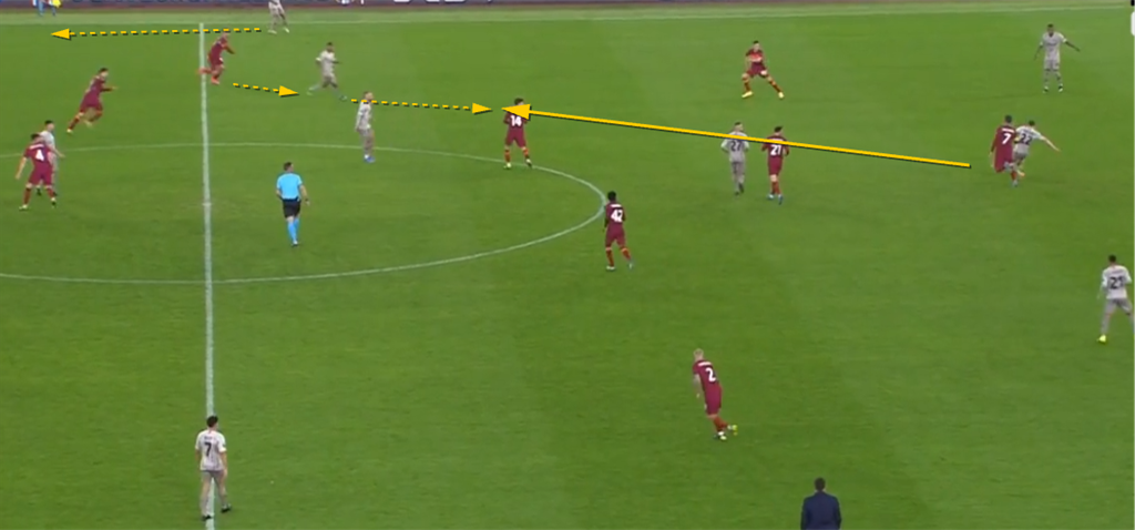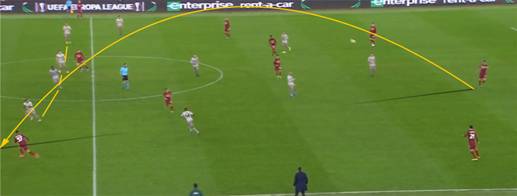 Рома атаковала разнообразно. Футболисты Фонсеки одинаково хорошо выбегали как в контратаки, так и строили свое позиционное наступление. Центральные защитники "горняков" находились в постоянном стрессе. Когда они в попытках сохранить компактность поднимались достаточно высоко, то сразу же получали передачи за спины на ход скоростным игрокам Ромы и вынуждены были на всех порах мчать за своими оппонентами.