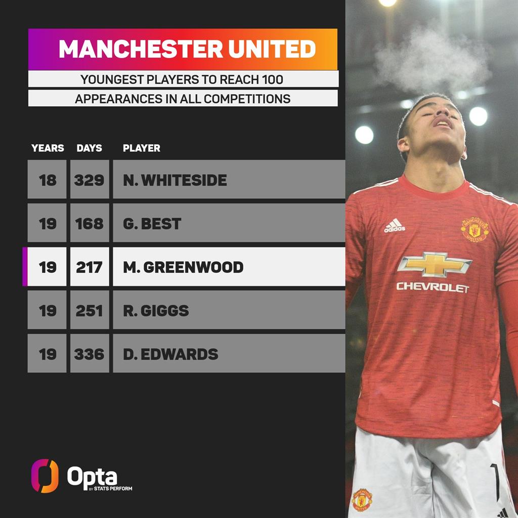 Среди игроков всех национальностей это третий показатель. Быстрее Гринвуда это удавалось Норману Уайтсайду (18 лет и 329 дней) и Джорджу Бесту (19 лет и 168 дней).