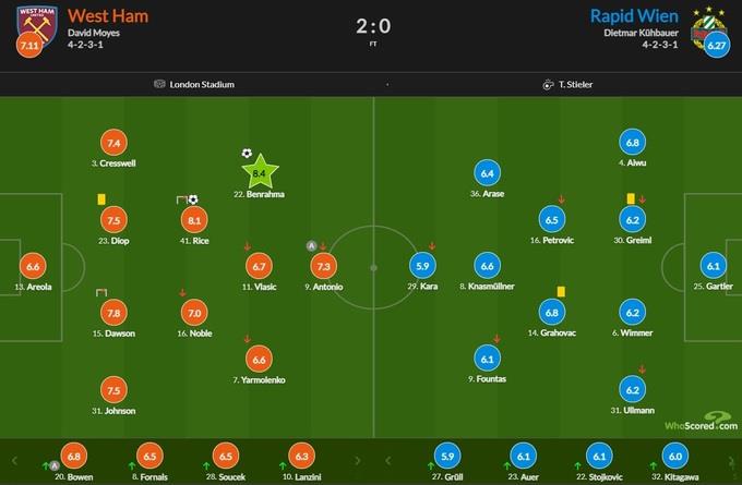 Согласно авторитетному порталу WhoScored, украинец получил одну из самых низких оценок в своей команде. Несмотря на предголевой пас Ярмоленко получил оценку — 6,6 балла. Это четвертый показатель в составе "молотобойцев".