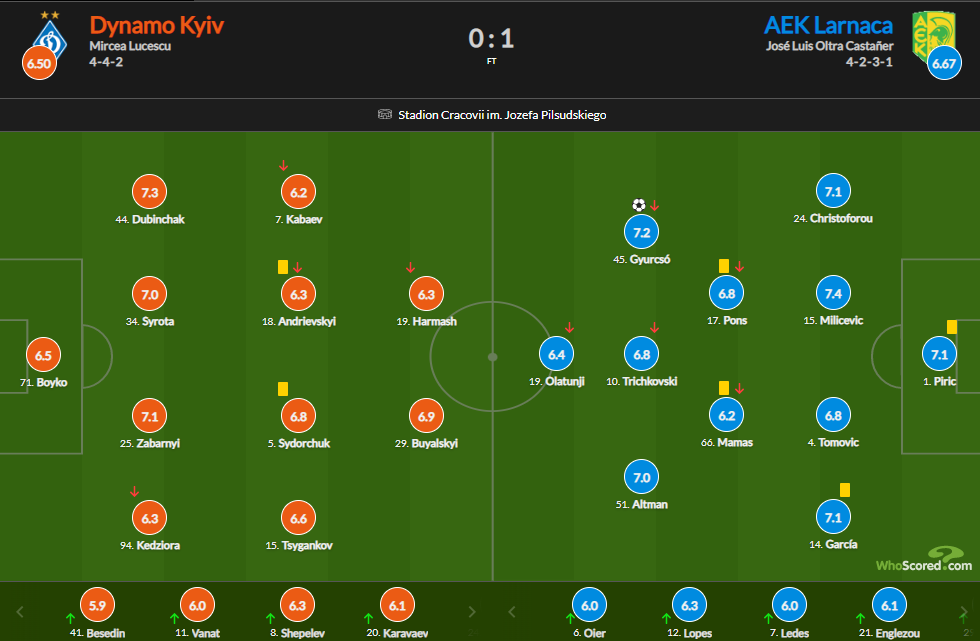 У рамках другого туру групового етапу Ліги Європи київське Динамо у номінально домашньому поєдинку програло АЕКу — 0:1.
