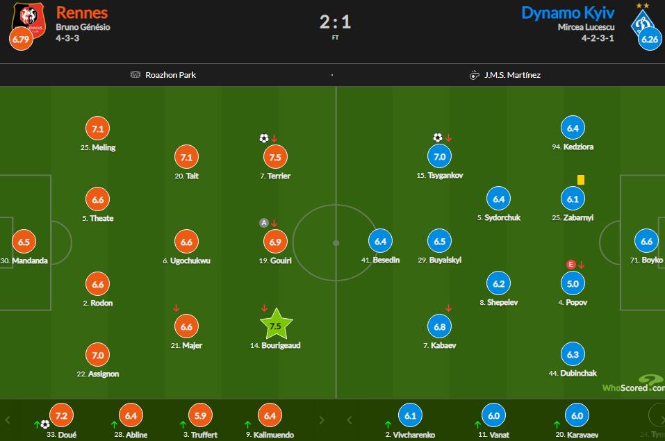 Найкращим гравцем у складі киян за версією статистичного порталу WhoScored був Циганков – 7 балів, а найгіршим Попов – 5,0. У складі Ренна найкращим був капітан команди Бенжамен Бурежо – 7,5 балів.