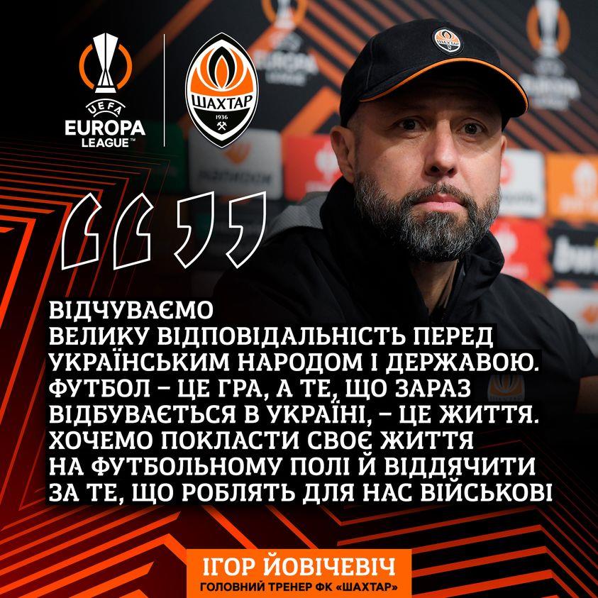 – Дійсно, від першого дня нашої подорожі, яка почалася пів року тому, ми завжди навіть на тренуваннях, а не лише на матчах, відчуваємо величезну відповідальність перед українським народом, перед Україною, перед воїнами, які б’ються за нашу свободу. І тут подяка їм щодня і сто разів на день. І ми хочемо, щоби вони, коли дивляться наші матчі, відчували гордість, пишалися б нашою битвою, нашою боротьбою, яку ми даємо на футбольному полі, незважаючи на результат.