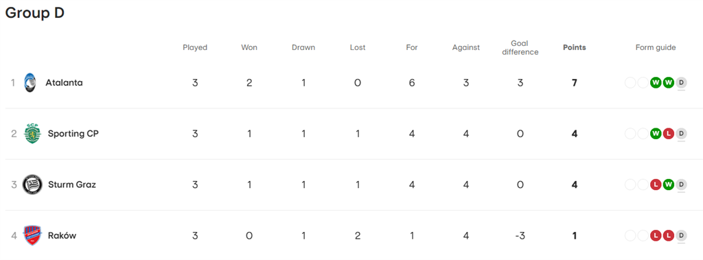 Нагадаємо, у паралельному поєдинку групи D гольовий пас Кочергіна врятував Ракув від поразки Спортінгу. Турнірне положення у групі після трьох турів наступне: