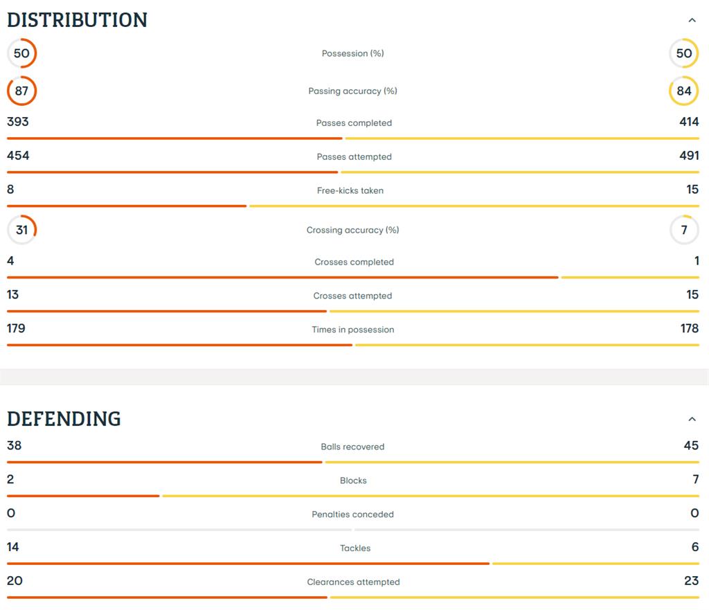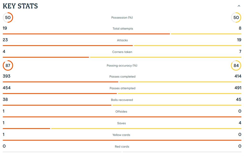 За статистикою можна відзначити рівну кількість володіння м'ячем — 50 на 50, але при цьому набагато більше моментів біля воріт "біло-синіх" — 19 проти 8 на користь німців.