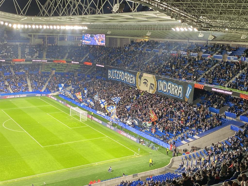 За декілька годин до матчу в місті особливо не відчувався футбольний ажіотаж. В центрі Сан-Себастьяна можна було побачити поодиноких фанатів Реал Сосьєдад в клубній атрибутиці, однак як не дивно, більшість з них були люди азіатської зовнішності. Напевно, без Такефусо Кубо тут не обійшлося. Приблизно за півтори години до матчу я вже підходив до стадіону Реале Арена (саме так називається стадіон Реал Сосьєдад, Аноета це назва спортивного комплексу на території якого й знаходиться стадіон). Чим ближче я підбирався до епіцентру майбутньої футбольної події, тим більше зустрічав баскських фанатів. Хтось з них пив місцеве пиво "18/17", хтось насолоджувався домашніми бутербродами з тортії та хамона, інші просто прогулювалися біля стадіону. Побачивши у натовпі високого молодого хлопця з українським прапором, мені стало цікаво дізнатися його думку про матч киян з Сосьєдадом. Любомир (так звуть того хлопця) райдужно посміхнувся мені, коли дізнався, що я український журналіст. Він, на диво, позитивно відгукнувся про Динамо, заявивши: "Я вірю в команду, в Олександра Шовковського та позитивний результат для українського клубу в сьогоднішній грі". Всім би стільки любомирівського оптимізму.
