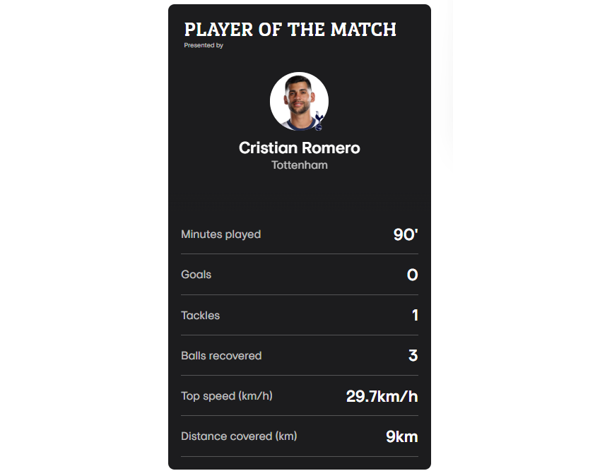 Як повідомляє офіційний сайт УЄФА, найкращим гравцем цього протистояння було визнано центрального захисника та віцекапітана "шпор" Крістіан Ромеро.